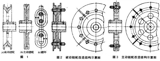 1)将其鍊輪由一體式改為可拆分式,具體見圖2、圖3。每個輪體上有8塊材質為45号鋼的可拆輻闆,由高強度螺栓與輪輻固定在一起,輻闆與輪輻組成的鍊槽形狀與原來相同。