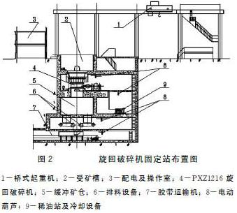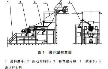 國内以旋回破碎機作為主機的破碎站大都是固定破碎站,國外同類産品中雖有相近能力的半移動破碎站,因為價格或者其他因素,在國内應用較少。所以以固定式破碎站作為比較對象,其配置如圖2。