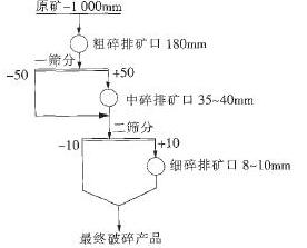 (1)一次篩分。硫化礦經洗礦脫泥後,+2mm礦石即兩層振篩篩上的礦石,彙總進入中碎;但還有一部分礦石未經過洗礦和粗碎,夾帶泥砂和大塊礦進入中碎,給中碎帶來困難。為了給中碎創造較好條件,中碎前的篩分,原來的棒條篩篩條間隙為70mm,這樣,篩下産品粒度偏大,即進入中細碎粒度偏大,後改為50mm間隙,+50mm礦石進入中碎進行破碎;-50mm礦石進入皮帶機,給入細碎。